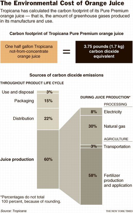 Here’s a graphic the “NY Times” did on the environmental footprint of orange juice. It indicates that the carbon dioxide emissions generated by transportation are a small fraction of the total generated throughout the entire life cycle of the product.