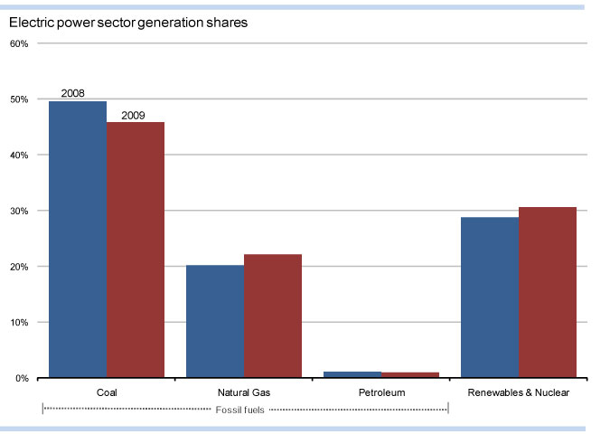 The FT quotes the EIA here: “… in 2009, the carbon intensity of the electric power sector decreased by nearly 4.3 percent, primarily due to fuel switching as the price of coal rose 6.8 percent from 2008 to 2009 while the comparable price of natural gas fell 48 percent on a per Btu basis.” And gas is not only cheaper, it’s, as we know, much cleaner than coal. Here’s a chart from the folks at America’s Natural Gas Alliance (ANGA) that illustrates to what extent.